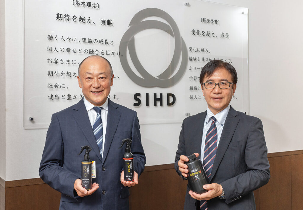 (写真)山田会長と横野教授が同窓生という縁から「Dr.OHNO」の製品化がスタートした。山田会長が持つのがスプレー型、横野教授が持つのがコーティング剤