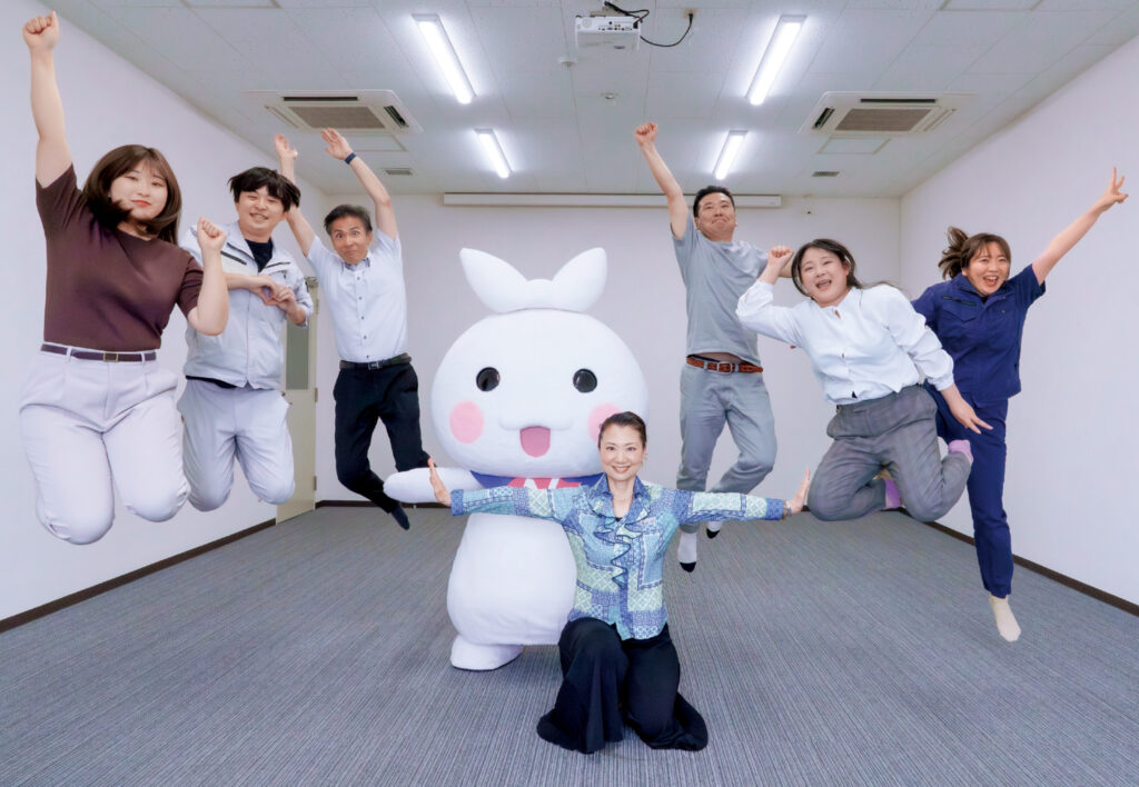 (写真)「楽しくなければ仕事じゃない」を体現する、渡邉裕美社長(中央)と本社スタッフ、マスコットキャラクター「ポリ美」